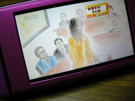 先月23日から開かれていた 米子の税理士ら殺害事件の裁判員裁判に今日判決が出ました。 今日はその判決が言い渡されるところのスケッチをしました。 被告も裁判員も皆がじっと裁判長の話を聴いていました。 裁判が終わった後の裁判員の会見で、 「短時間に集中、心を研ぎ澄ませて考えた貴重な体験だった」 と話していらっしゃいました。 また、今日は法廷にフジテレビの箕輪解説員も来ておられ、 「判決を聴いていて裁判員が被害者や被告、その家族などの心情を 深く考え結論を出していることがよくわかった。 裁判員裁判の良いところは、自分のことに置き換えて考え判断をする。 これはこれまでになかったこと。」 など話をされていました。 [...]