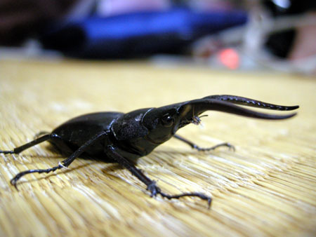 秋の足音が聞こえはじめている。 新型インフルエンザも怖い。 体力を維持しないと。 クワガタが 夏の終りを告げにやってきました。 後ろ足がうまく動かないようで、 引きずりながら・・・ つぶらな瞳が印象的 弱っているっていうのに このクワガタ飼う~と言って虫かごを用意したのは 父・・・ 無念 自由を・・・