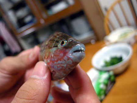 弟夫婦が魚釣りにでかけ、 小さなアジを大量に獲得してやってきました。 そのアジは、から揚げにされ、 小ぶりながらしっかりとした味でおいしかった。 そのアジの中に混ざっていた 一匹 ドーン 瞳の一番外側が美しい青 青ざめた唇からは、歯がむき出しに… 何というサカナでしょう。 知らない。 煮て食べられました。 こちらを見てる。
