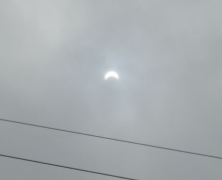 日食をちょっと見ました。 うす曇だったので、あのメガネなしで、 太陽が喰われている様がなんとなく、見えました。 平日だし、室内で働いているうちに終わっちゃうよね。 次回見ればいっか、 と思っていましたが、 「今、日食見えるよ!」 という叫びに カメラをもって飛び出しました。 ぎりぎりこんな感じで写しました。 雲にかくれたり、出たり、 首が痛かった。 次回も見たい。