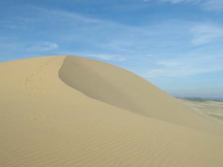 朝の砂丘も探しにいきました。 6:30ごろの砂丘です。 まだ人が歩いていないので、風紋がよく出ていました。 美しいフォルム。 誰もいないかと思ったら、 子どもたちと先生らしき団体が既に楽しそうに走り回ってました。 こんな朝早くから、元気だー。 どの部分の砂丘を絵にするか、 なかなかまとまらない。 まぁ、まとめようとせず、とりあえず描いてみる。