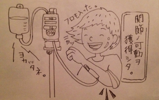 守りたいものができると、災害や地球環境、紛争、犯罪…世界が何だか不安で、怖くなってきています。自分自身強く、判断力も上げていかなくてはならないです。 さて、今日は入院15日目にして、2回目の風呂(節水したなぁ)ということで、点滴の針の差し替えを行い、ついに左肘関節の可動獲得いたしました。今回刺してる血管は、肘を曲げてもいいんです。 この1週間程、点滴が閉塞にならないように「左腕は1本の角材である」と自らに催眠をかけ、だましだましやってきましたが、正直、ずっと伸ばしっぱなしだと筋が痛かった。 点滴を外し、左手で自分の頬を触った時、何とも言えない懐かしさを感じました。