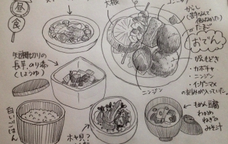 ジャガイモのキッシュが朝食に出てきました。茶色メインの煮物ばかりでなく、こんなおしゃれっぽいモノを家でも作りたいなぁと思いました。 昼には何とおでんが!おでん好きなんですよ。最後に家で作ったのはおでんだったなぁ。何食分かになるけど、下ごしらえに時間がかかります。あれで悪化したのかも(笑)