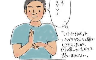 突然、バングラディッシュに2年住んでいたという大学の後輩が訪ねてきました。 ゴミだらけの家へと上がってもらった・・・怠慢です。 そして、な、なんと!こちらがおもてなしするどころか、逆にバングラディッシュ料理を食べさせてもらいました。 バングラディッシュは朝、昼、晩とオールカレーという、カレー王国だそうです。魚の入ったカレーを作ってくれました。他にも、豆やら芋やらキノコやら入っている、少しグリーンがかったイエローのスープカレー様のものでした。特徴的だったのは、炒めたオクラや茄子、モロヘイヤを後載せするところです。 さて「いただきます」というわけですが、スプーン等道具は使わず、右手を使って、手づかみで食べる文化でした。左手は、食事中右手に触れないようにしていました。「いただきます」というときも、右手が左手に触れないようにしていました。 子どもの頃から、「こら、手で食べるな。箸を使え、箸を!」と指導を受けていたので、手づかみで食べることに「やってもいいのかな」と一線を越える、ドキドキ感がありましたが、手で食べた方がおいしいと思いました。 親指、人差し指、中指の3本でごはんを固めて、口に入れる時は親指で押し出すようにして食べる。 カレーは唐辛子が利いていて辛かったのですが、さらっとしていて、とてもおいしかったです。オクラとモロヘイヤのヅルヅル感も最高です。おかわりし、2杯食べてしまいました。ごちそうさまでした。