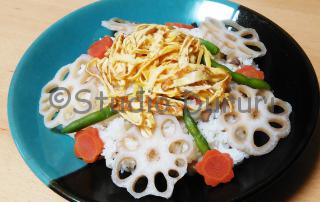 ちらし寿司のイラストを描くにあたり、まず調理し、食べるところから始めることにしました。 お祭りごとによく登場する「ちらし寿司」ですが、色々な具材が入っているので、これと汁でOK。献立に困った時などよく作っています。私は、これまで意識していませんでしたが、とても縁起の良い食べもののようです。しかも、「5色の具材で宇宙を表現している」らしい。「宇宙!」何とも壮大なスケール! さやいんげんの「青→木」、人参の「赤(紅)→火」、錦糸卵の「黄→土」、れんこんの「白→金」、椎茸の「黒(玄)→水」この5色。五行です。万物は5種の元素からなるということで「宇宙」のようです。 れんこんは、茹でて酢につけ、花形にカット。穴だらけなのでなかなか難しく、もう少しで穴だけになりそうでした。