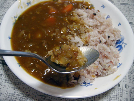 これがくじらカレーです! どこにくじらが入っているのか・・・ ゼラチン質でよく見えませんが 入っています。 くじらって食べたことがありませんでしたが、 魚の味でした。