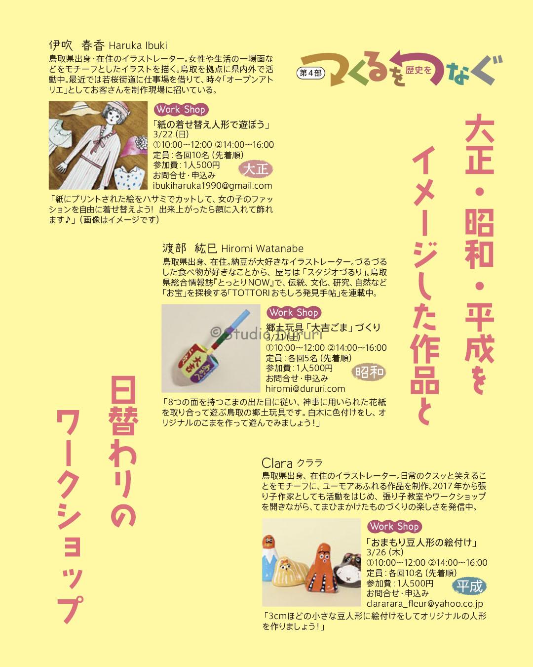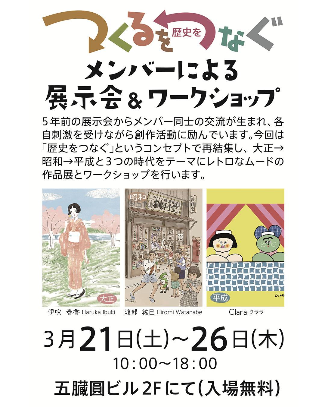 第4部で、Claraさんと伊吹春香さんと一緒に展示します。大正・昭和・平成をそれぞれ担当し、その時代のイメージから作品作って展示するというもの。日替わりで、ワークショップも開催。
