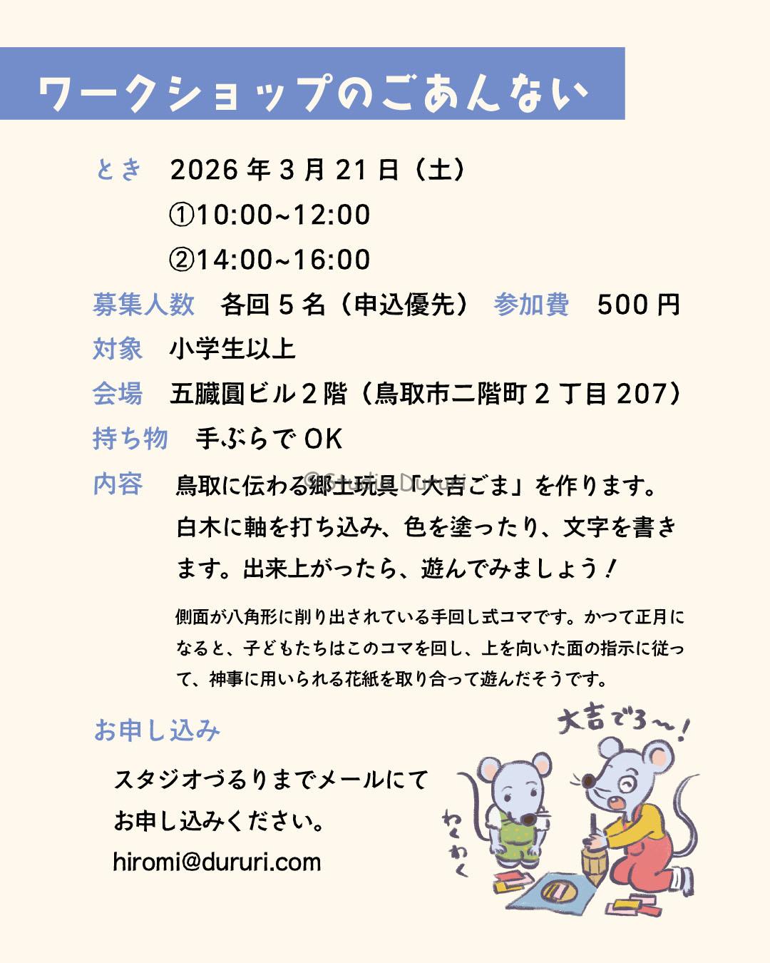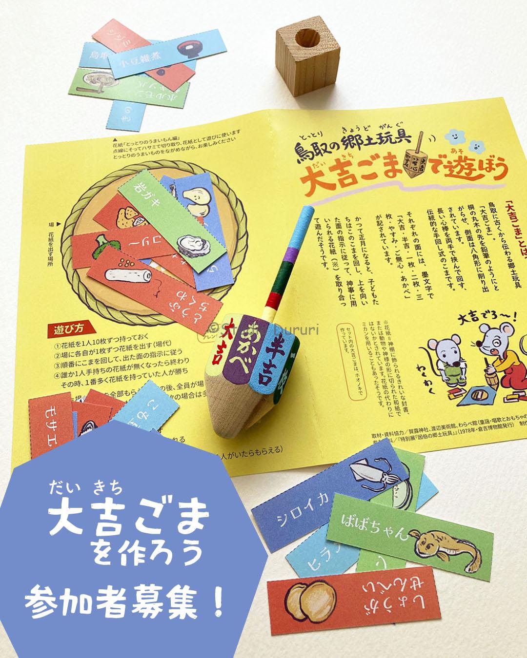鳥取に伝わる郷土玩具「大吉ごま」を作るワークショップのご案内です。3/21(土)開催。 登録有形文化財である五臓圓ビル(鳥取市二階町二丁目)で開催中のリニューアル15周年記念イベント内で開きます。 ホオノキ(まな板などに使われる木)から削り出してもらったコマの本体に軸を打ち込んで、色を塗ったり、「大吉、半吉、一枚、二枚、三枚、ご無心、あかべ、やすみ」の文字を書いたりして、オリジナルの大吉ごまを作るというものです。 出来上がったら、遊んでみましょう! 詳細は「ワークショップのごあんない」の画像をチェックしてください。 By 渡部 紘巳|2026-03-12T10:22:57+09:002026/03/12 AM 10:22|Works|0 コメント Share This Story, Choose Your Platform! FacebookTwitterWhatsApp電子メール About the Author: 渡部 紘巳 関連投稿 五臓圓ビルリニューアル15周年記念イベントに参加します! 五臓圓ビルリニューアル15周年記念イベントに参加します! TOTTORIおもしろ発見手帖「民俗行事あれこれ」 TOTTORIおもしろ発見手帖「民俗行事あれこれ」 ワークショップ「パターンをデザインしてグッズを作ろう」 Gallery ワークショップ「パターンをデザインしてグッズを作ろう」 クリスマスレクチャー2024(鳥取砂丘コナン空港) Gallery クリスマスレクチャー2024(鳥取砂丘コナン空港) 鳥の演劇祭17のセレクトショップに参加しています Gallery 鳥の演劇祭17のセレクトショップに参加しています TOTTORIおもしろ発見手帖「情熱と知恵の孔版画家・板祐生」 Gallery TOTTORIおもしろ発見手帖「情熱と知恵の孔版画家・板祐生」 わらべ館展示「おもちゃの病院」ひらめき分解図鑑 わらべ館展示「おもちゃの病院」ひらめき分解図鑑 新因幡の手づくりまつりに参加します! Gallery 新因幡の手づくりまつりに参加します! コメントする コメントをキャンセルComment Δ このサイトはスパムを低減するために Akismet を使っています。コメントデータの処理方法の詳細はこちらをご覧ください。
